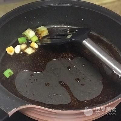 4、蔥蒜料汁加入料汁倒入剛才的煎魚鍋中。