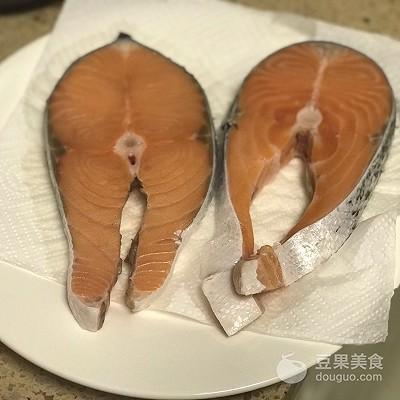 1、三文魚收拾干凈用吸油紙吸干水分。