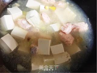 6.加入適量清水和準備好的豆腐自己鹽等調(diào)料。燒開后大火燉五分鐘。