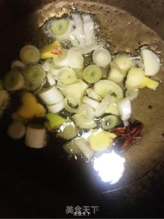 4.炒鍋倒入少量植物油,油五分熱時放入蔥,姜,蒜,八角。爆香。